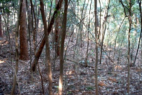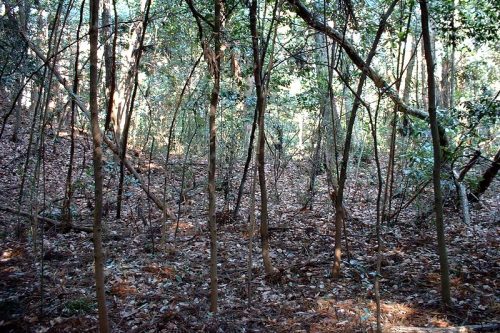 後円部。1号墳から南へ雑木の間を縫ってやっと発見。うすぼんやりと前方後円墳の形が見える。後円部の南側が抉れていたので盗掘にあっているのかもしれません。石室は見当たりませんでした。(2025年再訪時は藪がより酷くなっておりたどり着けなかった)