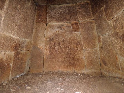 玄室。やや胴張りのプランで精微な凝灰岩のキリ石切組積。