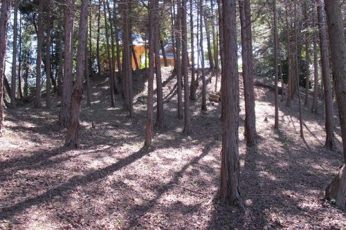 南から。左手前が前方部、右奥が後円部。雷電山古墳は、丘陵の頂上付近に築かれており、三千塚古墳群の盟主墳と考えられ、5世紀初頭の築造と推定されている。出土した埴輪は埼玉県では最古級のもの。