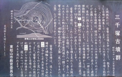 三千塚古墳群は大谷地区の丘陵(川越カントリークラブのある丘陵)に広く分布した古墳群です。前方後円墳3基と円墳150基からなり市指定史跡にとなっています。【アクセス】東武線森林公園駅から徒歩・自転車6.2km、神社駐車場、見学自由 ★地図★