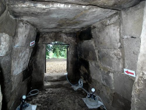 奥から。プランは胴張り。壁の黒ずみは後世に焚き火かなにかで煤けたもの。人が住んでいた時期があり、そのときに玄室の礫床は外に出してしまったらしい。