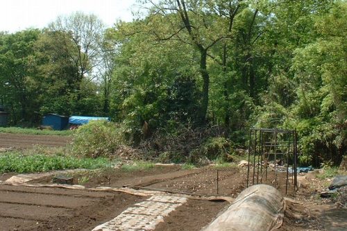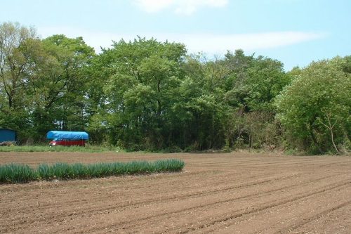 中央やや左の畑に突き出しているのが7号墳と思われる墳丘。残念ながら石室は確認できず。右の青いネットの奥が8号墳。さらに右奥に3号墳。撮影場所の背後には毛呂山町の大類2号墳。本当に古墳だらけ。