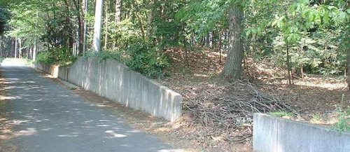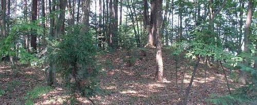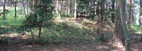 十社神社西側の道路の西の林の中(写真の道路の右側)にも28~40号墳が分布。神社南側の道を西に進んでいくと最初に見えてくるのがこの31号墳。道路で半壊となっている。