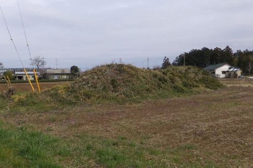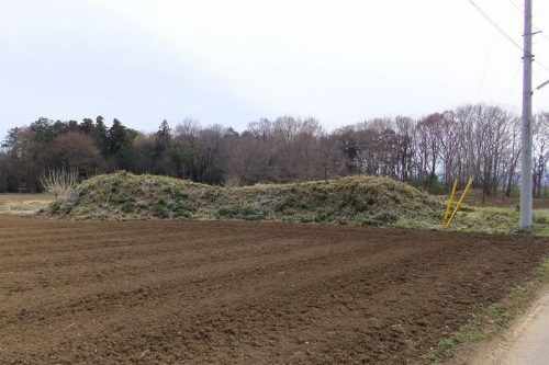 1号墳から坂戸市との境界の道を南西に行くと見えてくる。これもミニサイズの前方後円墳。耕作でだいぶ墳丘が削られているようだがまだまだ前方後円墳に見える。出土した土師器の特徴から6世紀前葉の築造と推定されている。右に見える道の右側は塚原古墳群が分布している。またこの奥の林の中に3~5号墳、左の林の中に13~16号墳がある。