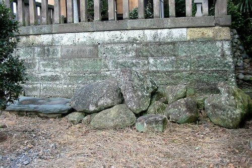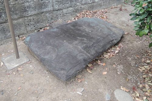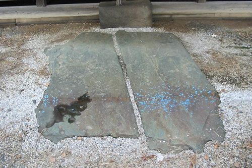 社殿前の敷石。緑泥片岩で石室材(天井石)と思われる