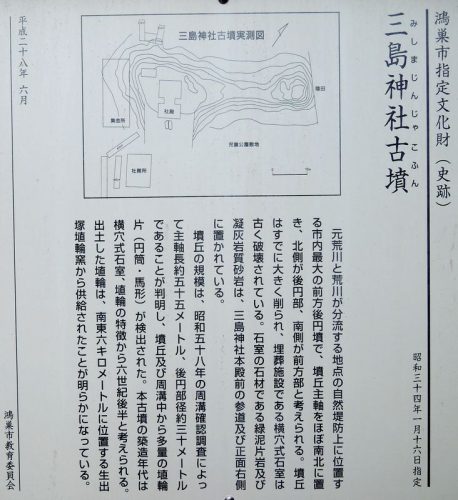 三島神社古墳 前方後円墳 墳長約55m、後円部径27.5m、同高1.5m、前方部幅15m、同高1.7m 明用字一ノ耕地 自然堤防・神社境内 土師器、埴輪、横穴式石室、周堀確認 埼玉の古墳