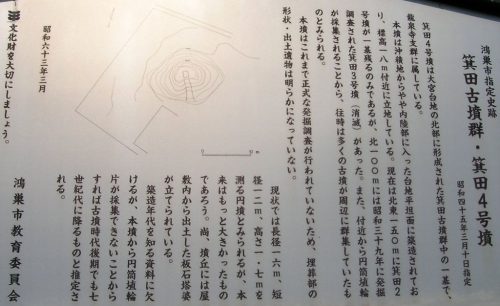 現地案内板より 鴻巣市指定史跡 箕田古墳群・箕田4号墳 昭和45年3月10日指定 箕田4号墳は大宮台地の北部に形成された箕田古墳群中の1基で、龍泉寺支群に属している。 本墳は沖積地からやや内陸部に入った台地平坦面に築造されており、標高18m付近に立地している。現在は北東150mに箕田2号墳が1基残るのみであるが、北100mには昭和39年に発掘調査された箕田3号墳(消滅)があった。また、付近から円筒埴輪が採集されていることから、往時は多くの古墳が周辺に群集していたものとみられる。 本墳はこれまで正式な発掘調査が行われていないため、埋葬部の形状・出土遺物は明らかになっていない。 現状では長径16m、短径12m、高さ1.7mを測る円墳とみられるが、本来はもっと大きかったものであろう。尚、墳丘には屋敷内から出土した板石塔婆が立てられている。 築造年代を知る資料に欠けるが、本墳から円筒埴輪片が採集できないことからすれば古墳時代後期でも7世紀代に降るものと推定される。 昭和63年3月 鴻巣市教育委員会