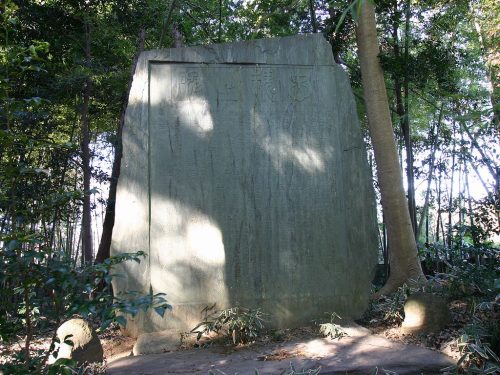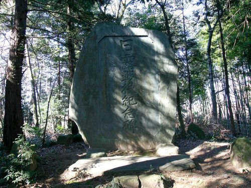 天井石は長さ3.31m、幅2.56m、厚さ22cmで忠魂碑として利用されている。(資料:さきたま古墳群 埼玉新聞社編)