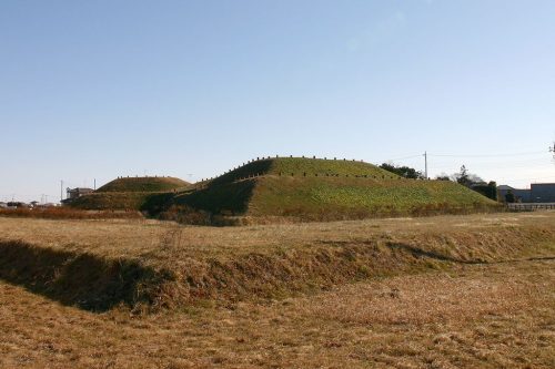 稲荷山古墳上から見る。左が将軍山古墳、右が二子山古墳。群中では一番後期の6世紀後半に築造されたと考えられている。明治27年に発掘されている。