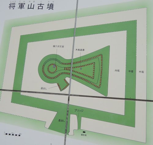 将軍山古墳 前方後円墳 90m 埼玉字上埼玉 台地・史跡公園 装飾太刀、鉾、鉄鏃、馬具、甲冑、銅椀、鏡、玉、耳環、石製盤、馬冑、蛇行状鉄器、須恵器、埴輪、横穴式石室1、直葬木棺1、二重周堀確認、後・前方部とも東半分削平 埼玉県古墳詳細分布調査報告書