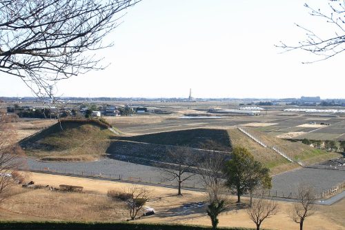 東から。右が稲荷山古墳、左奥が丸墓山古墳。