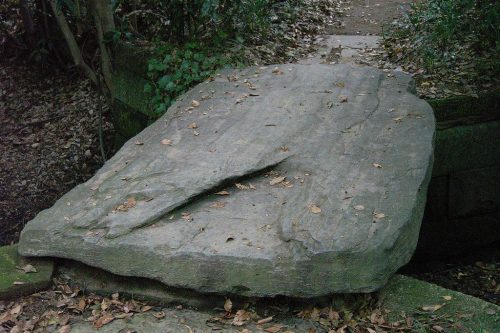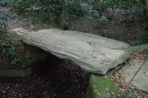 弁天社に架かる橋。緑泥片岩の一枚石で箱式石棺の底板と見られている。