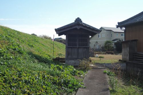 大塚古墳の西側近くの大福寺裏の利根川堤防。たぶんこの小さな堂の下が古墳と思われる。墳丘は堤防に取り込まれたものと思われる。