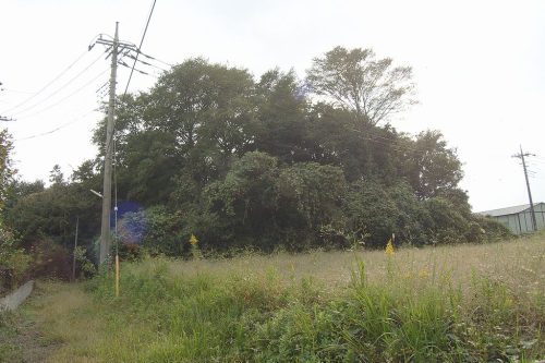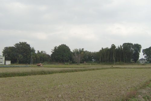西から遠景。左端の林が舟塚古墳。真中と右の林の中に小円墳である前通1号墳と2号墳が現存するらしいが未確認。