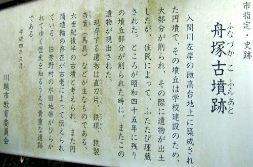 舟塚古墳 前方後円墳か円墳 50m? 上老袋字前通 自然堤防、宅地、畑 埴輪、直刀片、鉄環、鉄製杏葉 現地案内板、埼玉県古墳詳細分布調査報告書