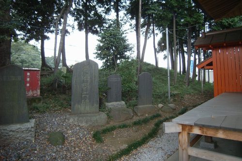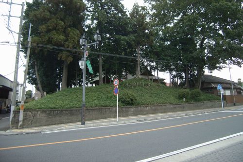 西から。小さな説明板があり、それによると残っているのは前方部らしい。(県道部分が後円部か?)昭和52年に県道西側が調査され周溝と鬼高式の土師器が検出されている。6世紀後半の築造と推定されている。