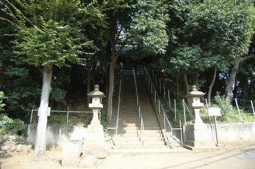 南から。富士浅間神社。境内には「占肩の鹿見塚」という旧跡の石碑と説明板があるがこれは東武線建設で消滅している。