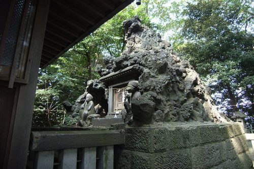 墳頂の社殿裏には浅間神社らしく富士塚がある。