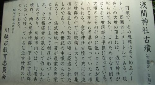 浅間神社古墳(母塚) 円墳 東西35.5m、南北38m、高さ約5.75m 富士見町 台地、神社境内 埴輪、直刀出土伝承 現地案内板、埼玉の古墳