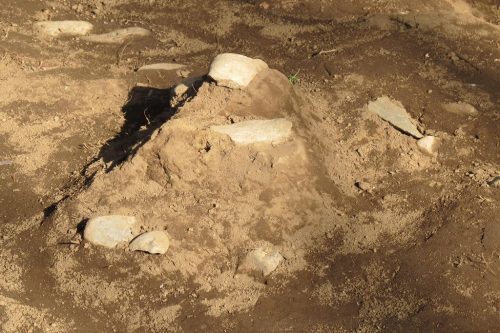 上円部裾の表土を剥いだところ。河原石と緑泥片岩が見られる。緑泥片岩は石室材の削りくずではないかと推定されている。河原石が葺石かどうかは不明とのこと。