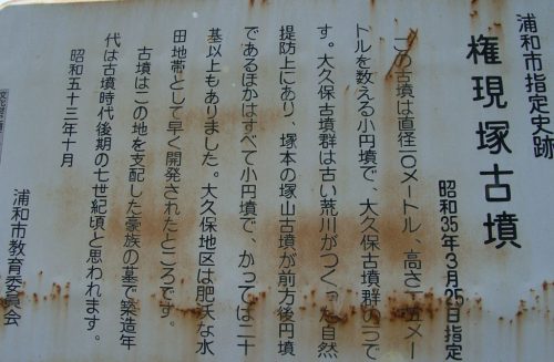 さいたま市権現塚古墳 80埼玉県, さ_さいたま市, 旧う_浦和市 コメントを追加 11月 122025 白鍬古墳群は、荒川に注ぐ鴨川左岸で八王子中学校の北西に分布しています。14基が確認されています。【アクセス】★地図★古墳名 墳形 規模 所在地 立地 出土品、備考 引用権現塚古墳 円墳 径10m、高さ1.5m 桜区大字白鍬 自然堤防 現地案内板、埼玉県古墳詳細分布調査報告書 南東から。宅地内に保存されている。許可をいただき近くから撮影。 西から。案内板では7世紀頃の築造。市指定史跡。 (撮影 2006/05) 返信する 返信をやめる Your Comment 以下のHTML タグと属性が利用できます: <a href="" title=""> <abbr title=""> <acronym title=""> <b> <blockquote cite=""> <cite> <code> <del datetime=""> <em> <i> <q cite=""> <s> <strike> <strong> Name (required) E-mail (required) URI 次回のコメントで使用するためブラウザーに自分の名前、メールアドレス、サイトを保存する。