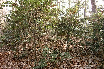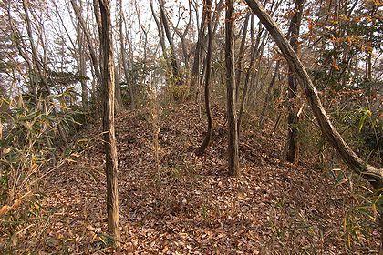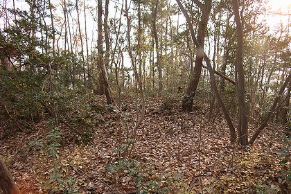 34号墳。この5基は調査区域北側の南北方向の尾根から東へ下る尾根上にある。34号は尾根沿いの道から祠のある38号へ至る道の分岐付近にあるので見つけやすい。尾根を北に進むと40~50号の分布域だが山土の採取場が迫り危険な状態。前方後円墳である44号はすでに消滅した。