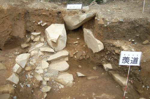 東向きに開口する横穴式石室。ロープの向こうは調査区域外で石室の全容がわからないのが残念。