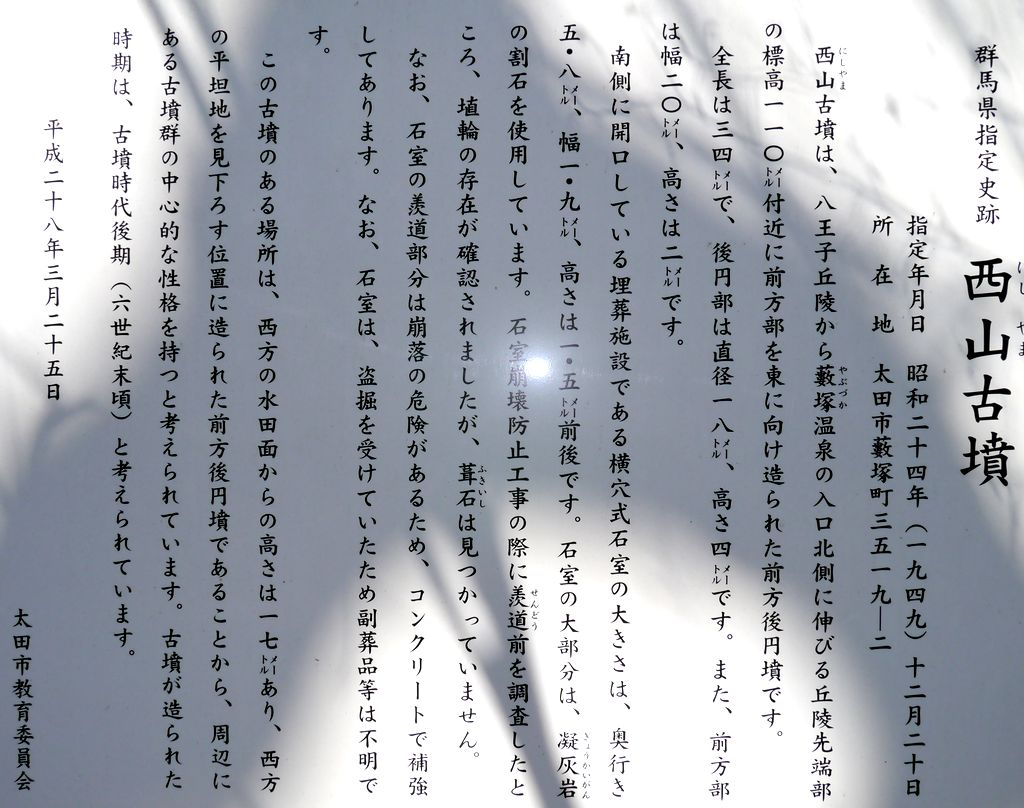 西山古墳(藪塚本町66号古墳) 前方後円墳 全長34m、後円部径18m、高さ4m、前方部幅20m、高さ2m 薮塚町 丘陵、山林 埴輪片、横穴式石室 現地案内板