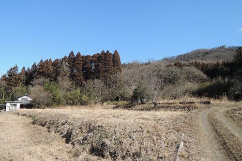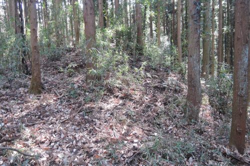 丸木古墳群大坂支群遠景。権現神社北西300mほどの山中に分布。円墳7基が知られているがさらに広がる可能性が高いとのこと。