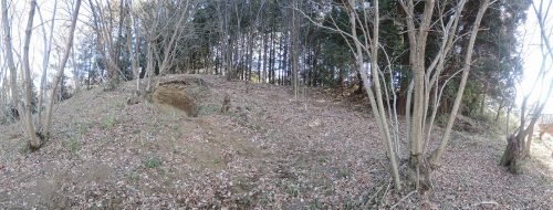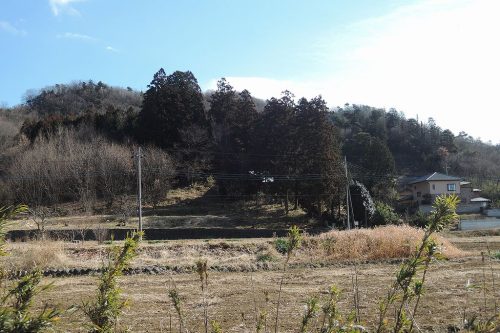 丸木古墳群上丸木支群遠景。権現神社周辺に前方後円墳1基、円墳8基が分布している。