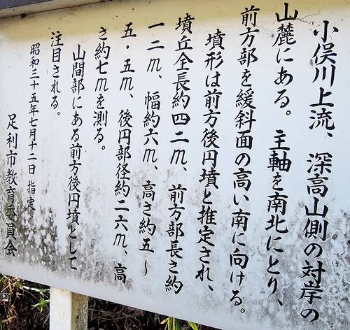 北から後円部。同じ小俣川沿いにある叶花古墳から2.8kmほど上流に単独で存在する前方後円墳。山間部で古墳時代に何らかの生産基盤があったとは思えない場所にある。
