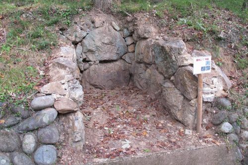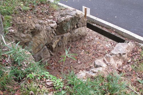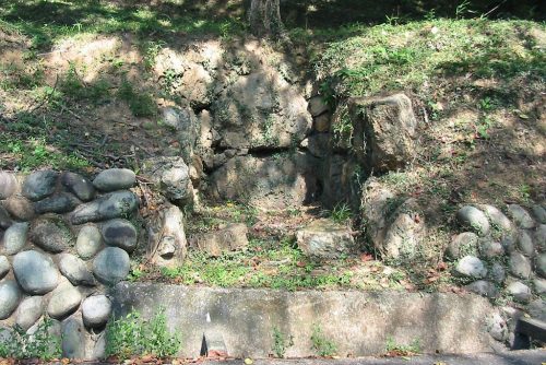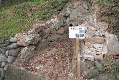 機神山山頂へ至る道の途中に両袖型の横穴式石室の一部のみ残っている。(2003/09)