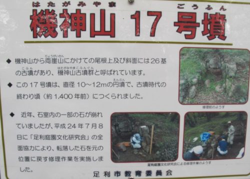 機神山17号墳(行基平1号墳) 円墳 径10~12m、高さ約2m 本城3丁目 山腹の東斜面 直刀、刀子、鉄鏃、横穴式石室、葺石 足利市文化財総合調査年報