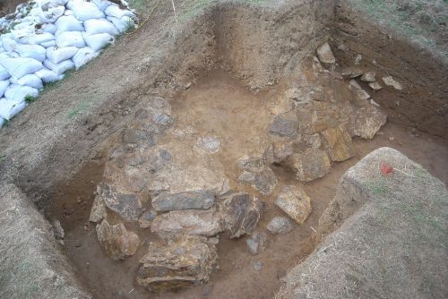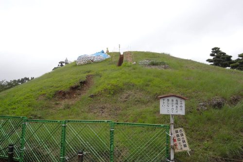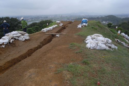 北側くびれ部付近。今回の調査で2段築成であることが判明。葺石はチャートの割石を使用し、2段目のみに葺かれている。