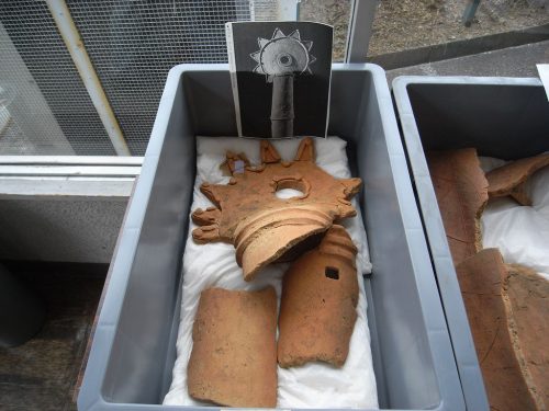 各トレンチからは円筒埴輪のほか形象埴輪(馬・太刀・ゆき・楯・さしば等)が出土。さしばとは偉いヒトの顔を隠すためのウチワみたいなものらしい。