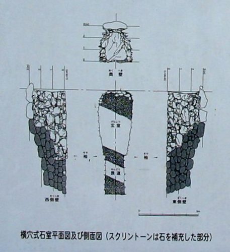 (現地案内板より抜粋)足利市重要文化財(史跡)口明塚古墳 平成4年6月25日指定この古墳は、クチア塚古墳とも呼ばれ、直径約45m、三段築成の円墳で、周囲のは幅約8mの周溝が巡ります。墳丘2段目斜面には山石と河原石からなる葺き石が施され、埴輪も並べられていたようです。内部主体には山石の巨石を積み上げた横穴式石室で、南向きに開口しています。羨道(玄室に至る道)は失われていましたが、両袖式で、推定全長8.7m、天井約2.5mで、左右の側壁は持ち送りがきつく造られています。発掘調査の結果、石室内部は後世に撹乱され、副葬品は出土しませんでした。山中や山麓に小規模な円墳が多い毛野地区の古墳の中で、この古墳は平地にあり、常見古墳群の中の正善寺古墳(前方後円墳 103m)、海老塚古墳(円墳 53m)についで大きく、これらの古墳とともに、6世紀頃の当地方における首長の墓と推定されます。また、山石の巨石を組み合わせた横穴式石室は、天井が高く、市内屈指の規模をもち、貴重であります。このたびの復元整備では、羨道及び天井石を補充、積み直し、墳丘の元のように盛り、張芝、一部葺き石を復元するとともに、周溝を砂砂利で表現しました。石室開口部左側にあるスイッチを押すと、石室内にライトが点灯し、内部の様子がわかるようになっています。また、石室内部を見学したい方は下記までご連絡ください。平成13年3月 足利市教育委員会連絡先 文化課