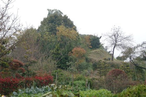 西から。勢至堂南東近くの民家敷地内にある。かつて南側に屋敷があり南斜面は切り崩されている。墳丘盛土から石田式土器が検出され、4世紀台にあった集落の上に築かれた可能性が高く、6世紀後半の築造と推定されている。