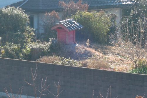 4号墳。民家裏の稲荷社となっている。西側半分のみ残っていて、河原石小口積の横穴式石室側壁が露出しているそうである。