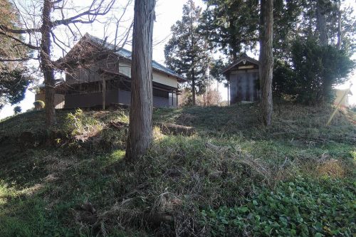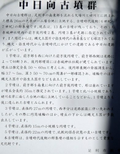 (南側にあった旧案内板より抜粋)史跡 中日向古墳群足利市の南東部-瑞穂野町から高松町に及ぶ台地にはおよそ15基以上の古墳があるが、ここの古墳群はその一部で、前方後円墳2基、円墳3基からなり台地の東端部を占める。1基の前方後円墳は、前方部とみられる西半分が道路で切断され、後円部の墳頂は平坦になり赤城神社の社殿が南面している。他の1基の前方後円墳は台地の東北部を占め眼下に姥川が東流する。前方部を概ね東南に向け、墳丘全長約35mを測る。墳丘に葺き石、埴輪は不明であるが墳丘形態から後期古墳で群集墳の様相を呈し、他の3基の円墳の主墳であろう。以上の古墳が群在するさまは極めて貴重である。昭和58年12月21日指定足利市教育委員会