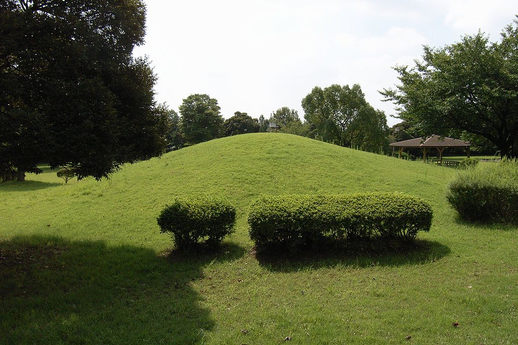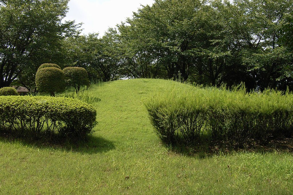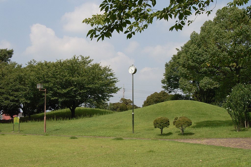休憩広場北側にある仮1号墳(左奥)と仮2号墳(右)。伊勢崎聖苑は群の北端にあたり、その敷地内に未調査の古墳10基が現状保存されている。