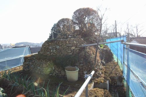 北西から。宅地や道路の造成などでやせほ細った尾根上にかろうじて石室部分が残っている。家庭菜園に取り込まれているようなので所有者に声をかけて見学。