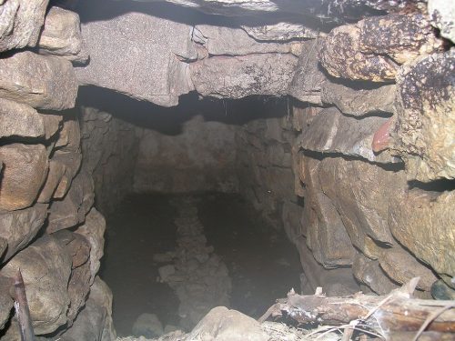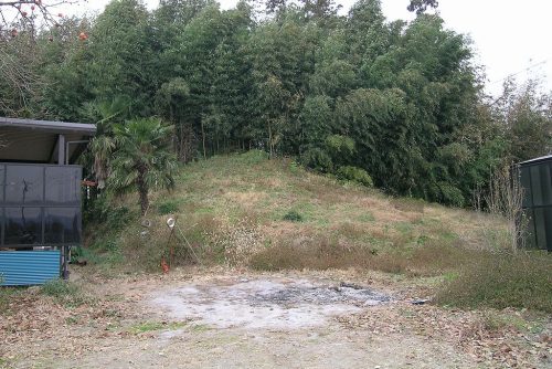 東から。トレンチ調査で5~20センチ大の河原石による葺石が確認されている。左側物置の建設で石室の羨道部の一部と前庭が破壊されている。