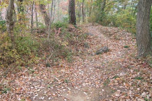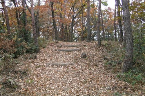 中山頂上から東へ尾根伝いに下る林間道。このあたりに8,11,12号墳があるはずだがはっきりとはわからなかった。写真中央辺りに大きな石がいくつか見られた。
