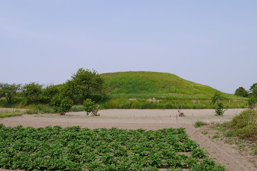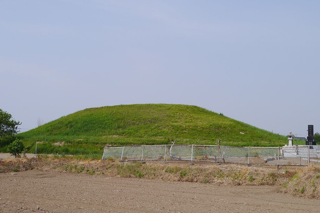 南西から。帆立貝形の前方後円墳。5世紀後半の築造と推定され近隣の同時代の古墳の中では最大規模。