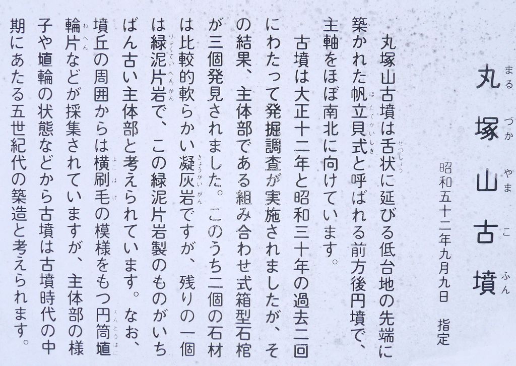 丸塚山古墳(殖蓮村17号古墳)前方後円墳(帆立貝形古墳) 全長81m、後円部径58m、高さ8m、張出部幅26m、くびれ部幅41m、長さ27m、高さ2.5m 三和町 台地 埴輪片、組合式箱型石棺×3 伊勢崎市史