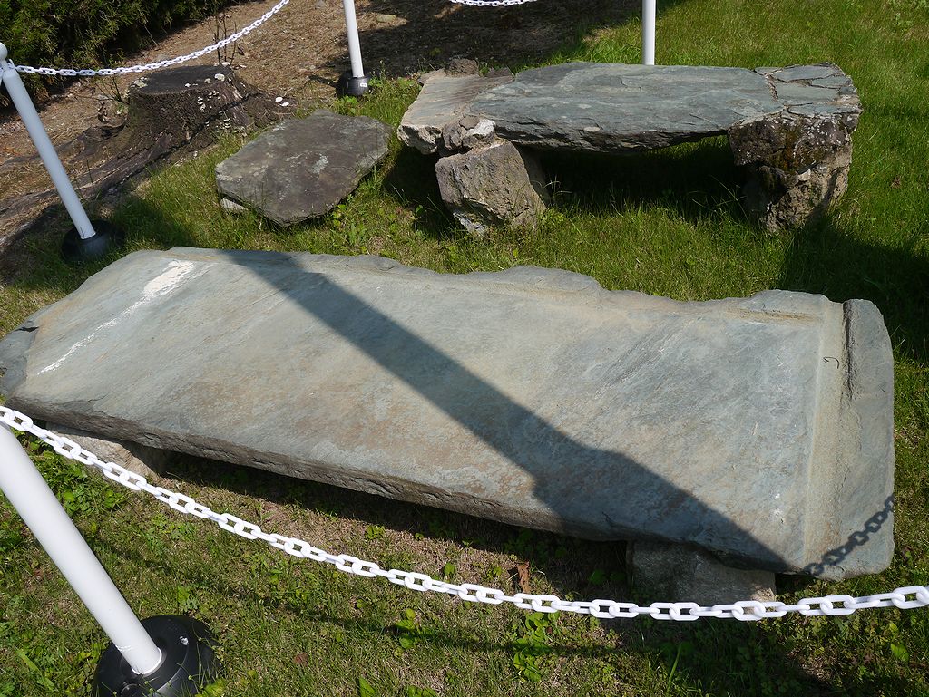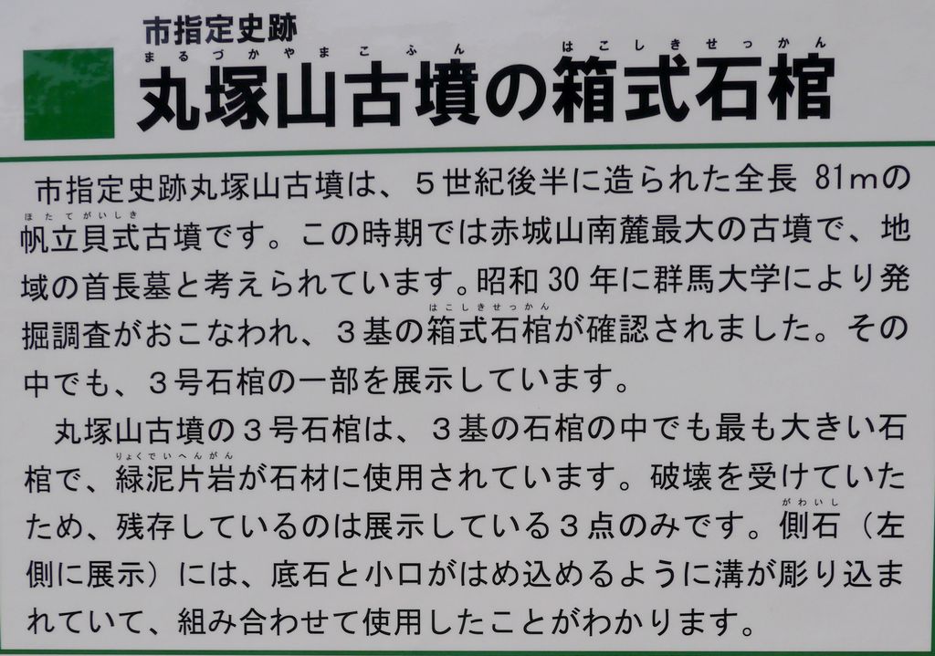 その内最も大型の3号石棺が2021年に所有者のご厚意で赤堀歴史民俗資料館に屋外展示された。緑泥片岩を用い全長約220cm。残存するのは石棺の部材3点のみのようだ。(隣接して台所山古墳出土石棺も展示されている。)