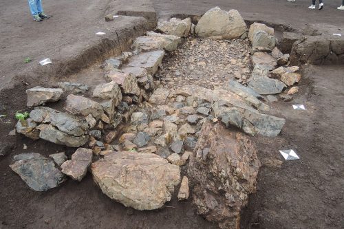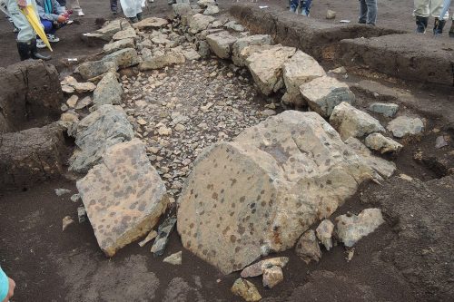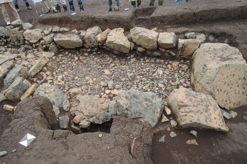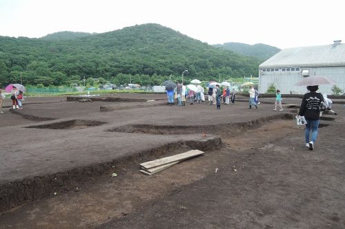 側面から。今回の調査区域では古墳時代の竪穴式住居が5軒、過去の調査で前期3軒、中期22軒、後期59軒が検出されておりムラが形成されていたと考えられる。