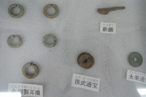 耳環は19号墳の石室から出土。貨幣は調査区域内の中世墳墓群から。