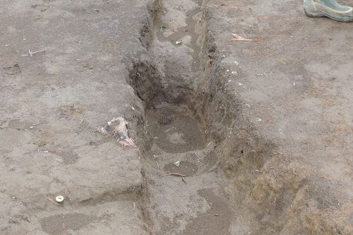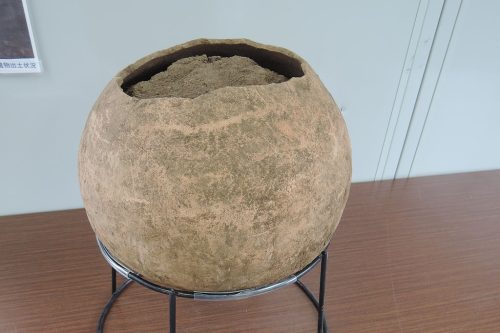 溝の一部を掘りこんで壺棺が納められていた。本来の埋蔵施設は中央にあり、これは追葬によるものと推定されるとのこと。