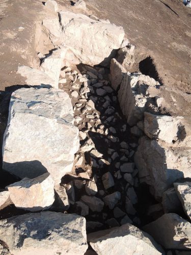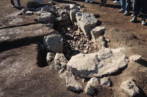 写真奥に見える古墳時代竪穴式住居跡の上に築かれた古墳。横穴式石室の下部のみ残る。